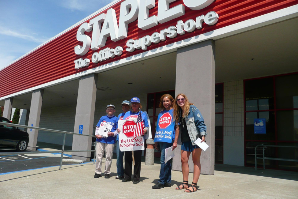Members of the Postal Workers Union and supporters picket outside of a Staples office supply store.